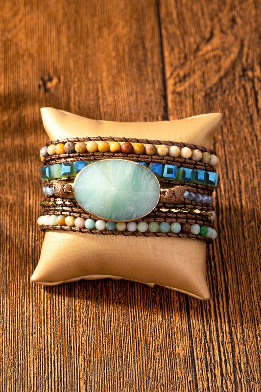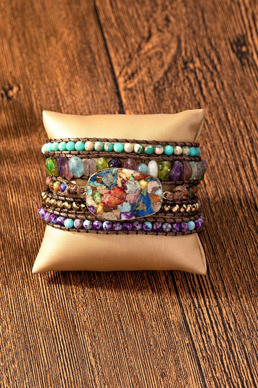 Handcrafted natural stone beaded wrap around bracelet with a large turquoise stone in the middle.